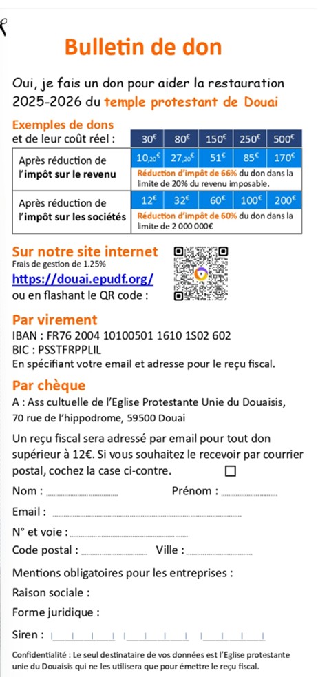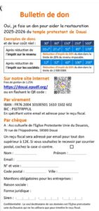 Tout don, aussi modeste soit-il, est indispensable et précieux. Il manifeste de votre attachement à l’Eglise protestante Unie de Douai, et aussi de votre volonté de préserver à notre patrimoine.