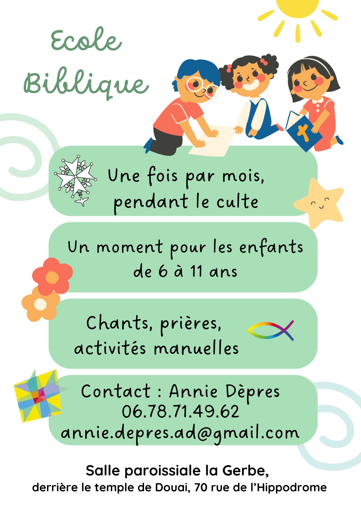 Nous proposons aux enfants, âgés de 6 à 11 ans, de découvrir les récits de la Bible. Un moment pour eux, une fois par mois, avec des chants, prières et activités manuelles, dans la salle paroissiale, pendant le culte dominical.